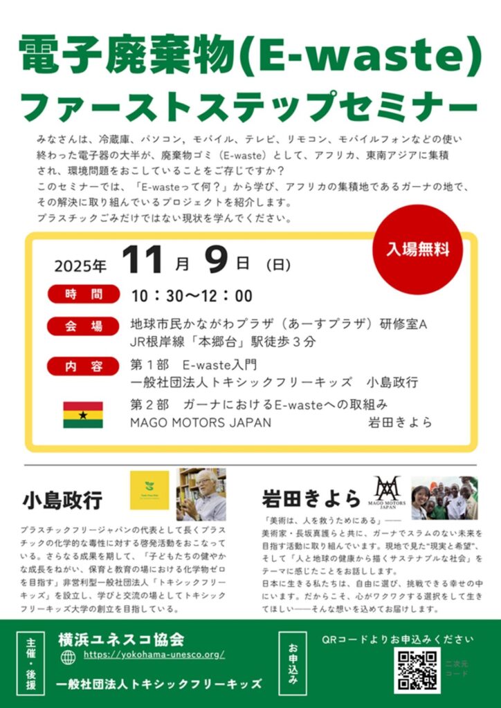 | 内 容 | 第1部 E-waste 入門 一般社団法人トキシックフリーキッズ 小島政行 第2部 ガーナにおけるE-wasteへの取り組み MAGO MOTORS 岩田きよら |