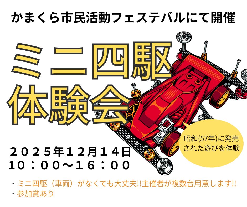 昭和100年の今年に因み、昭和57年に発売され3世代にわたり愛されてきた日本が誇る「ミニ四駆」をサーキットで走らせる体験会です。