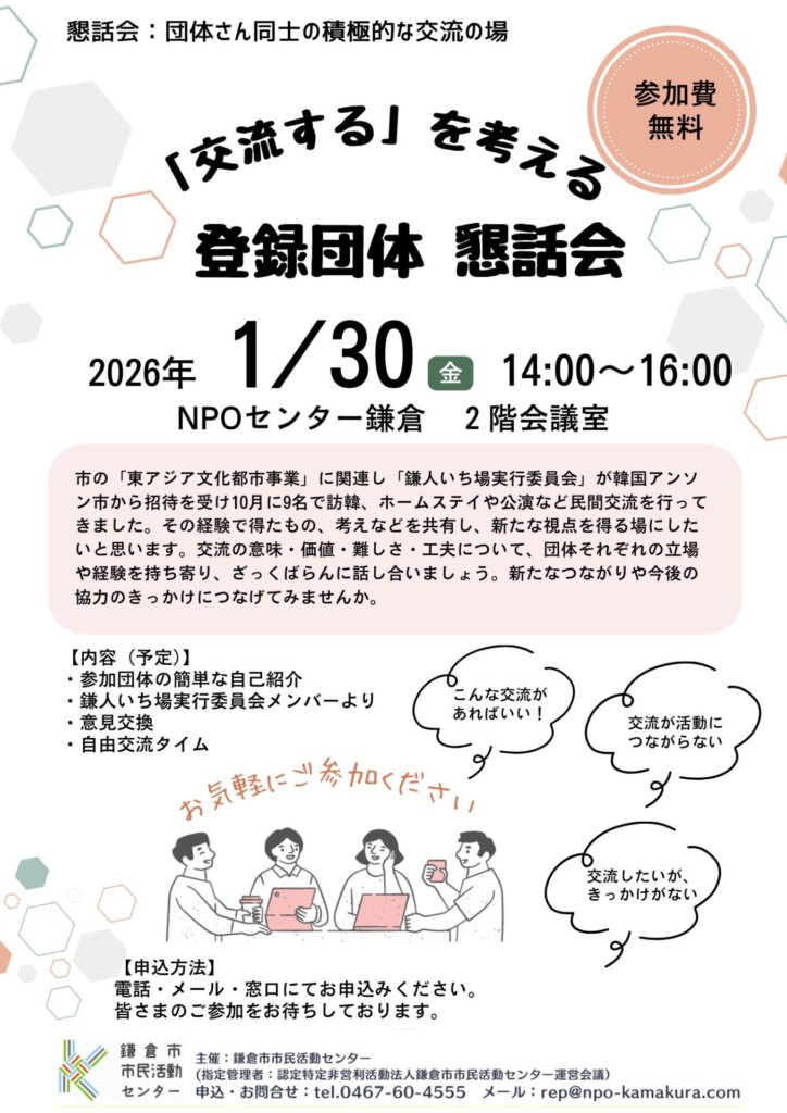 市の「東アジア文化都市事業」に関連して「鎌人いち場実行委員会」が韓国アンソン市から招待を受け10月に9名で訪韓、ホームステイや公演など民間交流を行ってきました。その経験で得たもの、考えなどを共有し、新たな視点を得る場にしたいと思います。交流の意味・価値・難しさ・工夫について、団体それぞれの立場や経験を持ち寄り、ざっくばらんに話し合いましょう。新たなつながりや今後の協力のきっかけにつなげてみませんか。今回は「交流イベントをする」ことが目的ではなく、交流の意味・価値・難しさ・工夫について、団体それぞれの立場や経験を持ち寄り、ざっくばらんに語り合う場とします。「こんな交流があったらいい」「これはうまくいかなかった」など、そんな実感ベースの意見を共有する会を目指しています。お茶でも飲みながらのお話会ですので、どうぞお気軽にご参加ください。