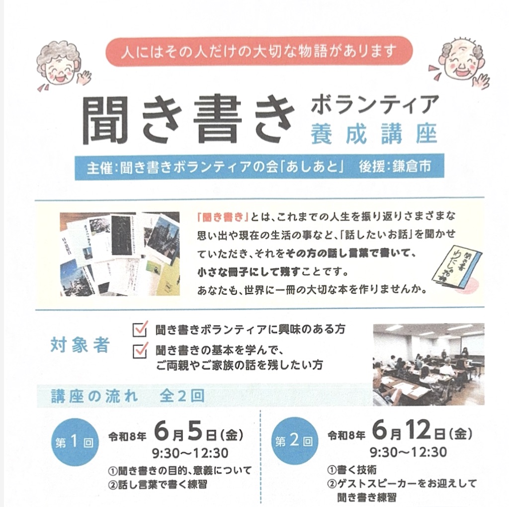 世界にたった一つの自分の本を作るお手伝いをしてみませんか。これまでの人生を振り返りさまざまな思い出など、「話したいお話」を聞かせていただき、それをその方の話し言葉で書いて、小さな冊子にして残すボランティアです。今回はそんなボランティアの養成講座を全2回で開講します。ご興味のある方は、ぜひご参加下さい。