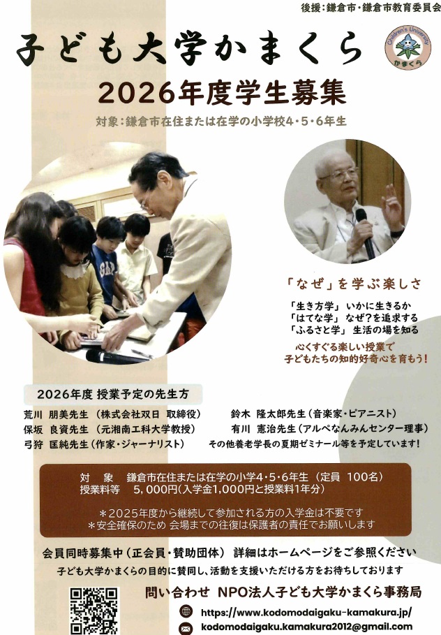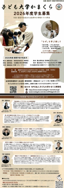 | 問合せ | NPO法人子ども大学かまくら事務局 https://www.kodomodaigaku-kamakura.jp/ |