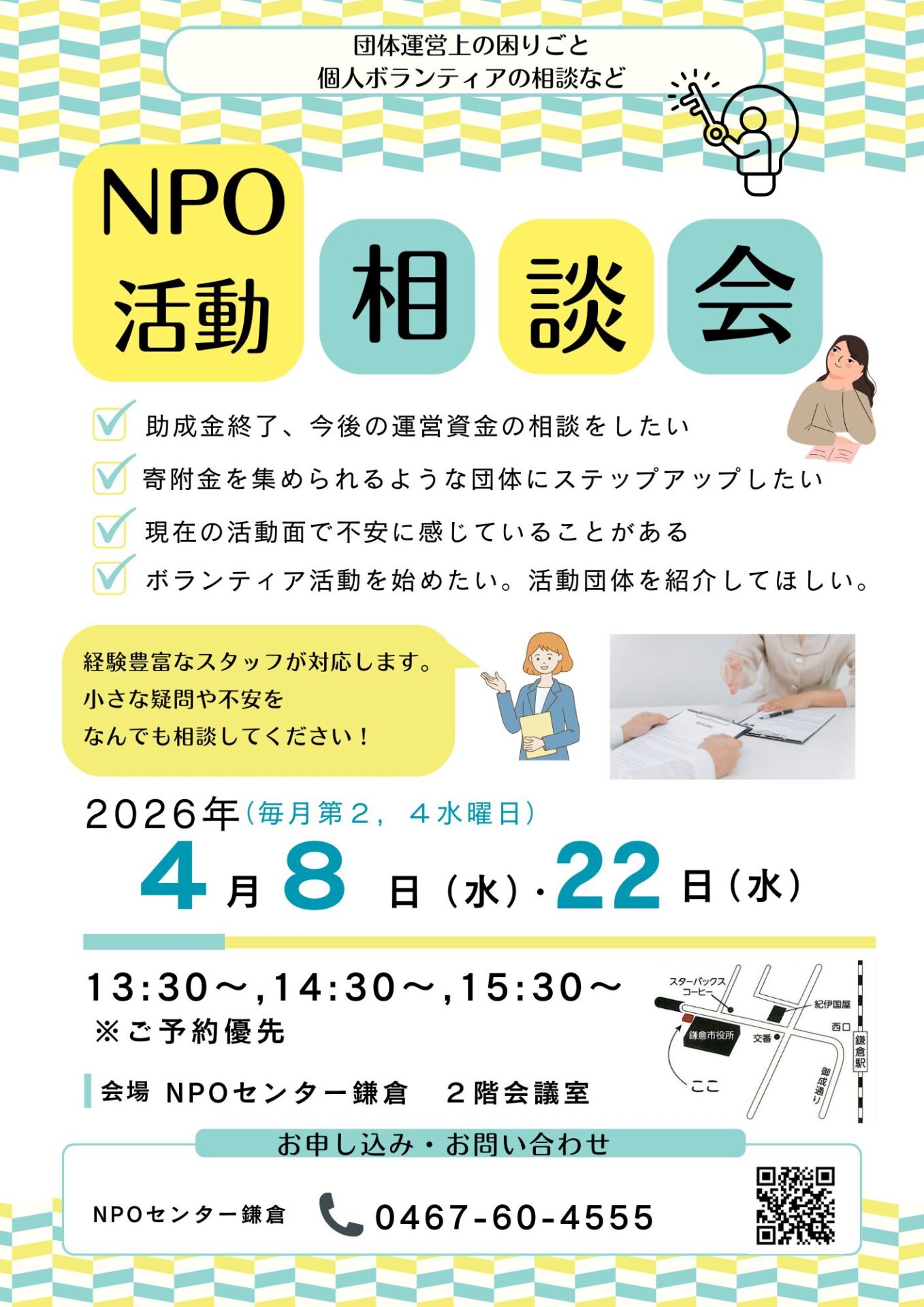 こちらの連絡先へご連絡ください。※対面・オンライン相談は予約が必要です